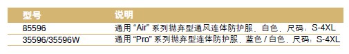 • 抛弃型连体防护服均符合欧洲化学防护服第五、六级粉尘及有限喷溅型防护标准